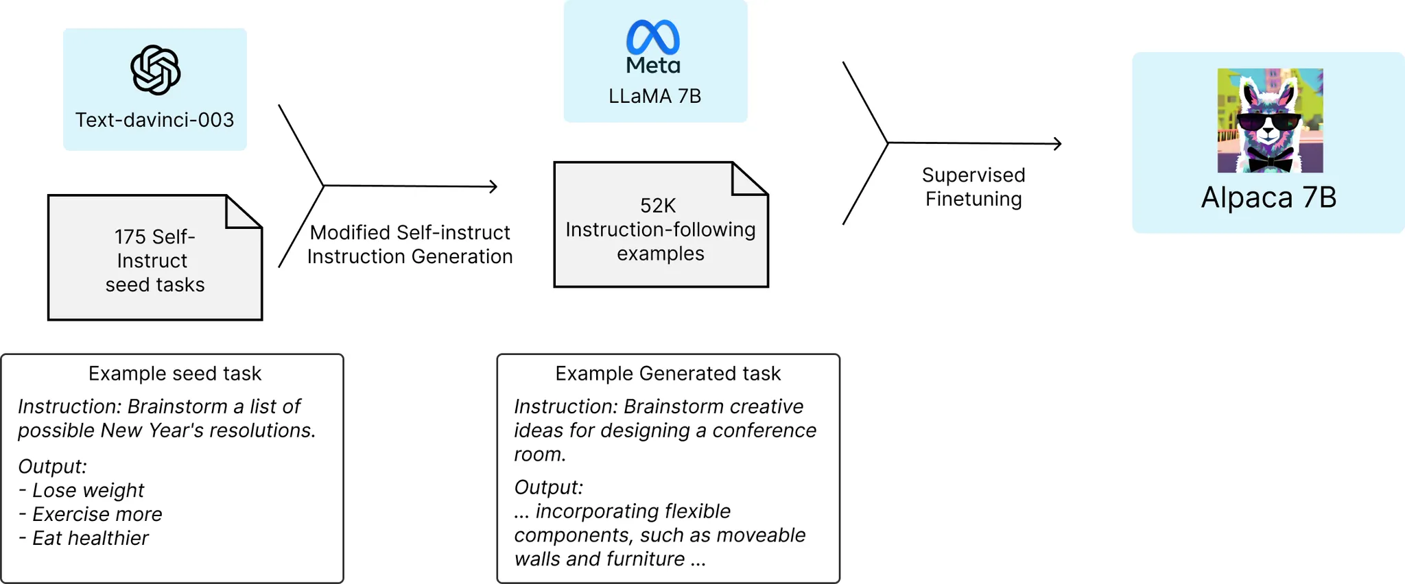 Stanford CRFM에서는 효율적인 Size(7B)의 Instruction-following 모델, Alpaca 구축을 위해 다음과 같은 방법을 사용