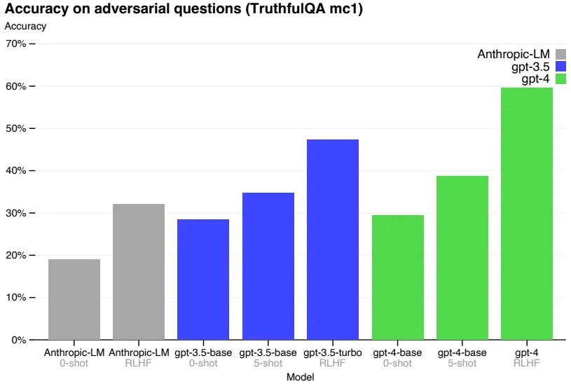 논문에서는 RLHF Post-Training이 GPT 모델의 고질적인 문제, Hallucination을 완화시킨다고 주장 (TruthfulQA, 위 그림)