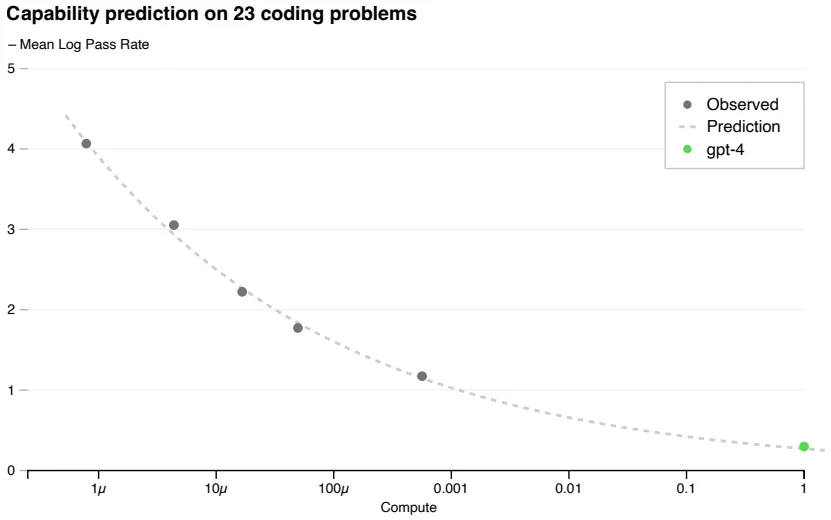 구체적으로, 최종 GPT-4보다 짧게 학습된 (적은 연산량의, 최대 1/10,000) 모델들로부터 최종 모델의 Loss (위 그림), Capability (아래 그림)를 유추할 수 있다는 의미