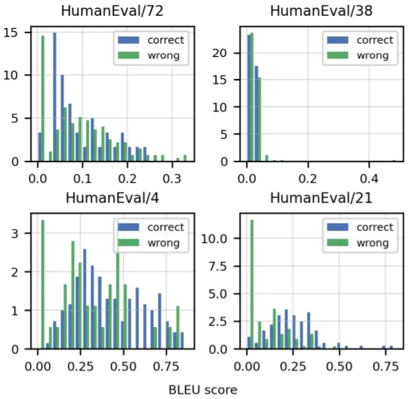 Code ์์ฑ์ ๊ฒฝ์ฐ์๋ Model Size๊ฐ ์ฆ๊ฐํ ์๋ก ๊ทธ ์ฑ๋ฅ์ด ํฅ์๋๋ฉฐ, ์ค์  ์๋น์ค์์์ ๊ฐ์ด ์์ฑ๋ Sample๋ค ์ค Top K๋ฅผ ์ ํํด์ผ ํ๋ ๊ฒฝ์ฐ, Mean Token Log Probability๋ฅผ ๊ณ ๋ คํ๋ ๊ฒ์ด ์ข๋ค๊ณ  ํ๋ค. ๋ง์ง๋ง์ผ๋ก, ๋ค์ ํ๋ BLEU Score์ ๋ฐ๋ฅธ ์ ๋ต+์ค๋ต Sample์ ํ๋ฅ  ๋ฐ๋๋ฅผ ๋ํ๋ด๋๋ฐ, ํน๋ณํ ์๊ด์ฑ์ด ์๋ ๊ฒ์ผ๋ก ๋ฏธ๋ฃจ์ด ๋ณผ ๋, (์์ ์ธ๊ธํ๋ฏ) Code ์์ฑ์ Evaluation Metric์ผ๋ก BLEU Score๋ฅผ ์ฌ์ฉํ๋ ๊ฒ์ ์ ์ ํ์ง ์๋ค๊ณ  ํ๋จ๋๋ค.
