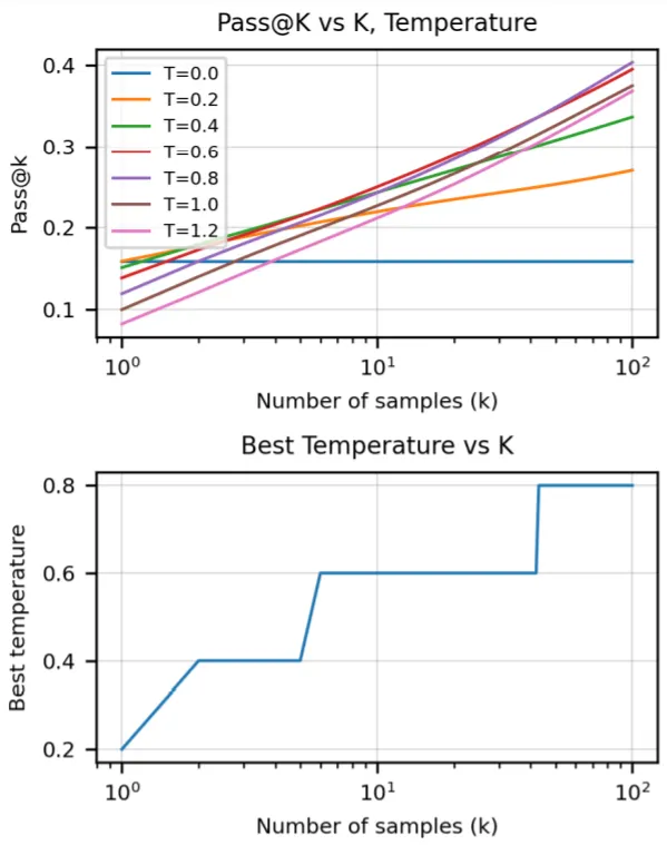 ์คํ์ Sample Code์ ์(k), Generation์ Sampling Temperature, Model Size ๋ฑ์ ๋ณ๊ฒฝํ๋ฉฐ ์ํ๋๋ค. ๋์ผํ ๋ชจ๋ธ์ ๊ฒฝ์ฐ, ๋ ๋ง์ ์์ Sample Code๋ฅผ ์์ฑํ ์๋ก ์ ๋ต๋ฅ ์ด ๋์์ง๋๋ฐ, k๊ฐ ์ฆ๊ฐํ ์๋ก ์์ฑ๋๋ Sample์ Higher Diversity๋ฅผ ๋ณด์ฅํ  ์ ์๋ ํฐ ๊ฐ์ Temperature๋ฅผ ์ค์ ํ๋ ํธ์ด ์ ๋ฆฌํ๋ค(์๋ ํ ์ฐธ์กฐ).