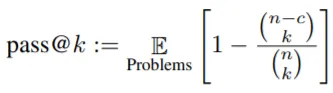 n์ k๋ณด๋ค ํฐ ์์ด๋ฉฐ, c๋ ์ ๋ต Sample์ ๊ฐ์์ด๋ค. ํด์ํ๋ฉด, k๊ฐ 5์ผ ๋(pass@5), 30๊ฐ(n=30)์ Sample์ ์์ฑํ๊ณ , ์ด๋ค ์ค์ 10๊ฐ(c=10)์ ์ ๋ต์ด ์กด์ฌํ๋ค๊ณ  ๊ฐ์ ํ์. ์ด ๊ฒฝ์ฐ, 30๊ฐ Sample์์ 5๊ฐ๋ฅผ ๊ณ ๋ฅด๋ ๊ฒฝ์ฐ ์ค ์ ๋ต์ด ์๋ 20๊ฐ์ Sample์์๋ง 5๊ฐ๋ฅผ ๊ณ ๋ฅด๋(์ค๋ต๋ง์ ์ ํํ๋) ํ๋ฅ ์ 1์์ ๋นผ์ค ๊ฐ์ด pass@5๊ฐ ๋๋ ๊ฒ์ด๋ค.