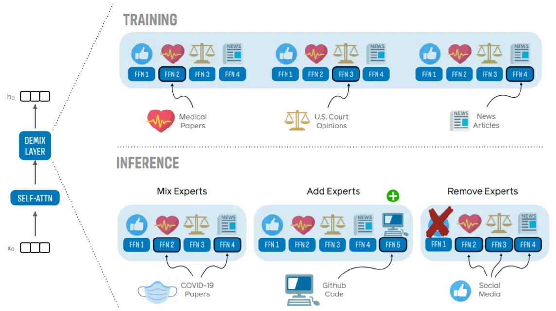 DEMIX Layer는 위 Component와 동일한 형태를 갖지만, Token Level에서 Routing이 이루어지며+Token당 최대 2개의 Domain이 부여되는 기존의 방식과 다르게, 같은 Sequence에 존재하는 Token들에 모두 동일한 하나의 Domain을 부여한다. (Domain별 Metadata 활용).