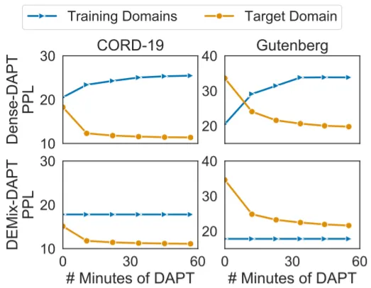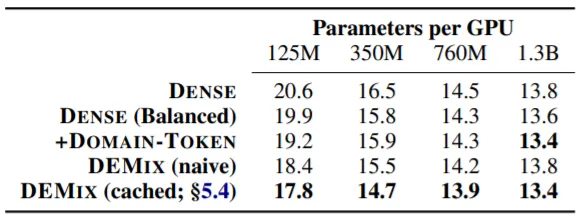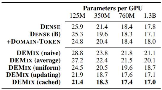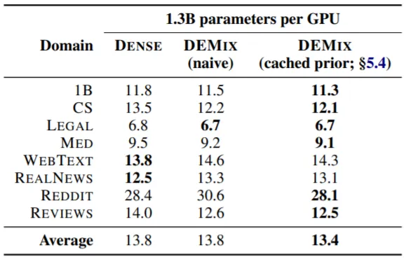 실험 결과를 살펴보면 크기가 ~760M인 LM들에서는 DEMIX (naive)가 DENSE 계열 LM들에 비해 좋은 성능을 보이는 것을 확인할 수 있다. 하지만 1.3B LM에서는 성능이 개선되지 않았는데, 이는 LM의 크기가 커지면 Dense Training을 통해 Domain-Specific한 정보를 충분히 학습할 수 있음을 증명한다.