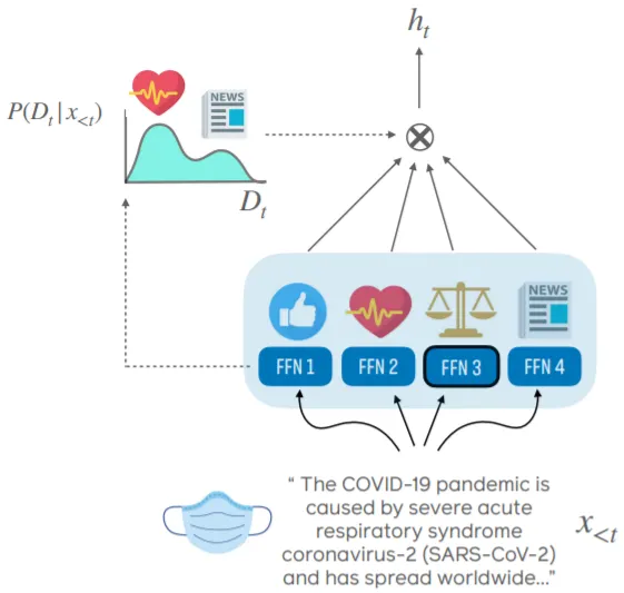 기존의 Mixture-Of-Experts Transformer에서 FFN Components는 (특정 Domain으로의) Routing Function(g_n)과 Domain별 FFN Layer로 구성된다.