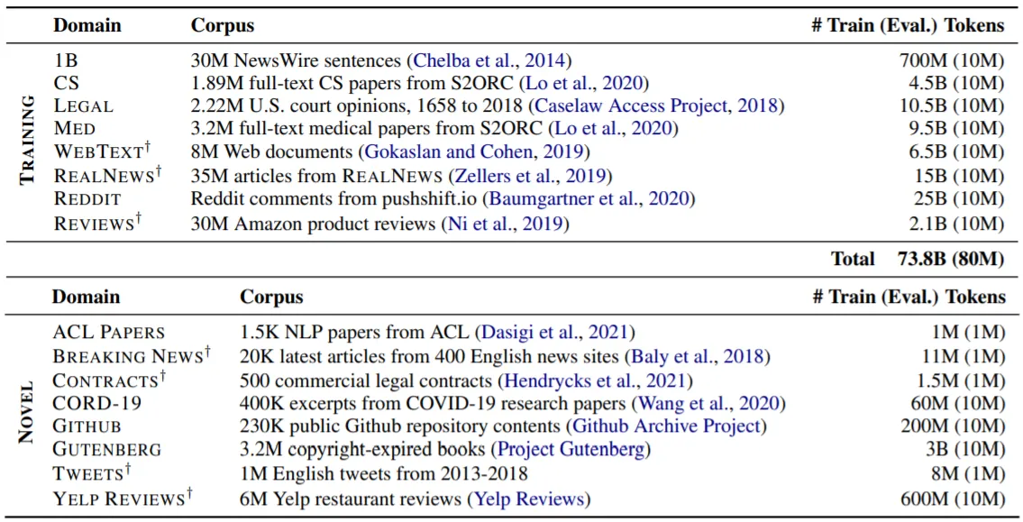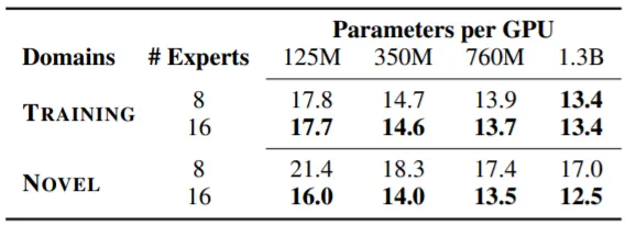 학습 과정에서 Training Data로 총 8개의 Expert를 구축하고, 실험에서는 8종류의 In-Domain Data와 8종류의 Out-Of-Domain(Novel) Data로 LM의 (Generalization)성능을 평가한다.