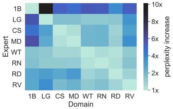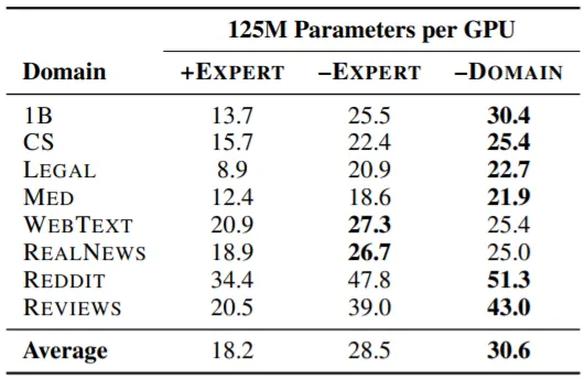 1.3B LM의 8개 Expert를 다른 Domain에 적용했을 때 결과이다. Web Text와 Real News의 경우 다른 Domain Data에서도 PPL이 크게 증가하지 않음을 알 수 있다. 즉, 두 Domain은 다른 Domain과 겹치는 부분이 많다는 뜻으로, Web Text와 Real News에서 (결과적으로 비슷한 Data를 더 많이 학습하게 된 형태의) DENSE가 가장 좋은 성능을 보이는 이유가 설명된다.