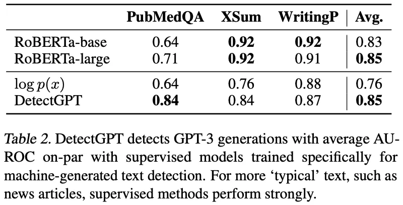 Target LM의 크기가 작을 때에는 DetectGPT가 Fine-Tuned RoBERTa에 준하는 성능을 보이지만, 175B GPT-3를 Target LM으로 사용했을 때에는 좋지 못한 성능을 보임