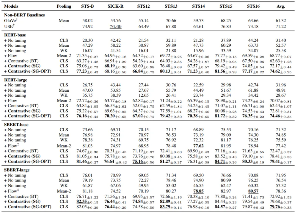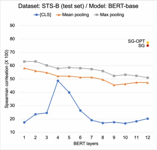 BERT๋ฅผ Sentence Encoder๋ก ์ฌ์ฉํ๊ธฐ ์ํด์๋ Downstream Task๋ก (Supervision์ ํ์ฉํ) Fine-Tuning์ ์ํํ์ฌ์ผ ํ๋ค. ๋ง์ฝ Labeled Data๊ฐ ์กด์ฌํ์ง ์๋ ๊ฒฝ์ฐ, BERT์ ๋ง์ง๋ง Layer(s)๋ฅผ Mean Poolingํ์ฌ ์ฌ์ฉํ๋ ๊ฒ์ด ์ผ๋ฐ์ ์ธ๋ฐ, ์ด๋ ์ข์ ์ฑ๋ฅ์ ๋ณด์ด์ง ๋ชปํ๋ค. (์๋ ํ ์ฐธ์กฐ). ์๋์ ํ๋ฅผ ํตํด Pooling๊ธฐ๋ฒ๊ณผ Pooling์ ์ฌ์ฉํ๋ Layer์ ๋ฐ๋ผ Sentence Embedding ์ฑ๋ฅ์ ํธ์ฐจ๊ฐ ๋งค์ฐ ํฐ ์ ์ ์ ์ ์๋๋ฐ, ์ด๋ ํ์ฌ BERT๋ฅผ ํ์ฉํ Sentence Embedding์ด ์ถฉ๋ถํ Solidํ์ง ์์ผ๋ฉฐ, BERT์ Expressive Power๋ฅผ ๋ ํ์ฉํ  ์ฌ์ง๊ฐ ๋จ์ ์์์ ์๋ฏธํ๋ค.