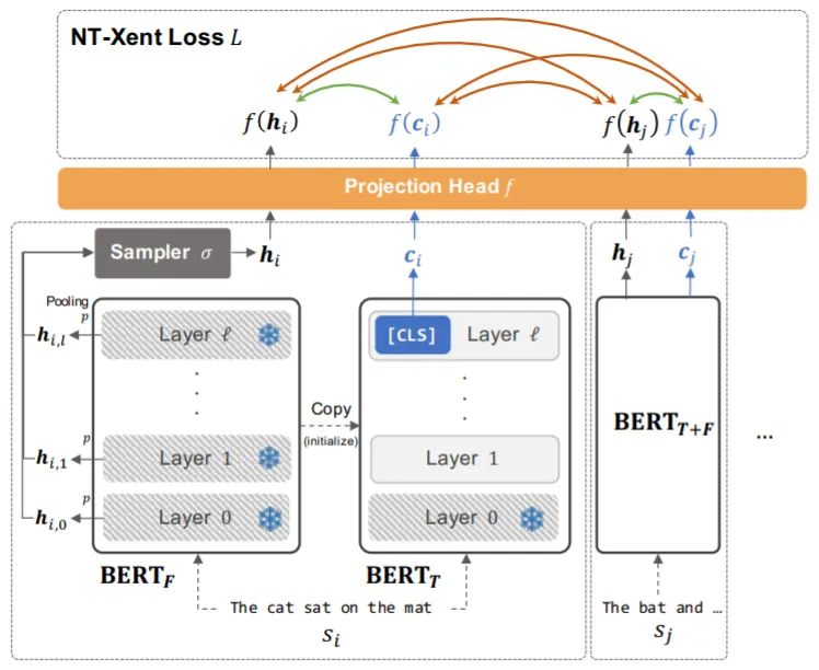 Sampling๋ ์ด๊ธฐ Layer Representation, h_i์ Sentence Embedding, c_i๋ ๊ฐ๊ฐ Projection Head(f)๋ฅผ ๊ฑฐ์น ํ, ๋ค๋ฅธ ๋ฒกํฐ๋ค๊ณผ์ Cosine Similarity(g) ๊ณ์ฐ์ ํ์ฉ๋๋ค.
